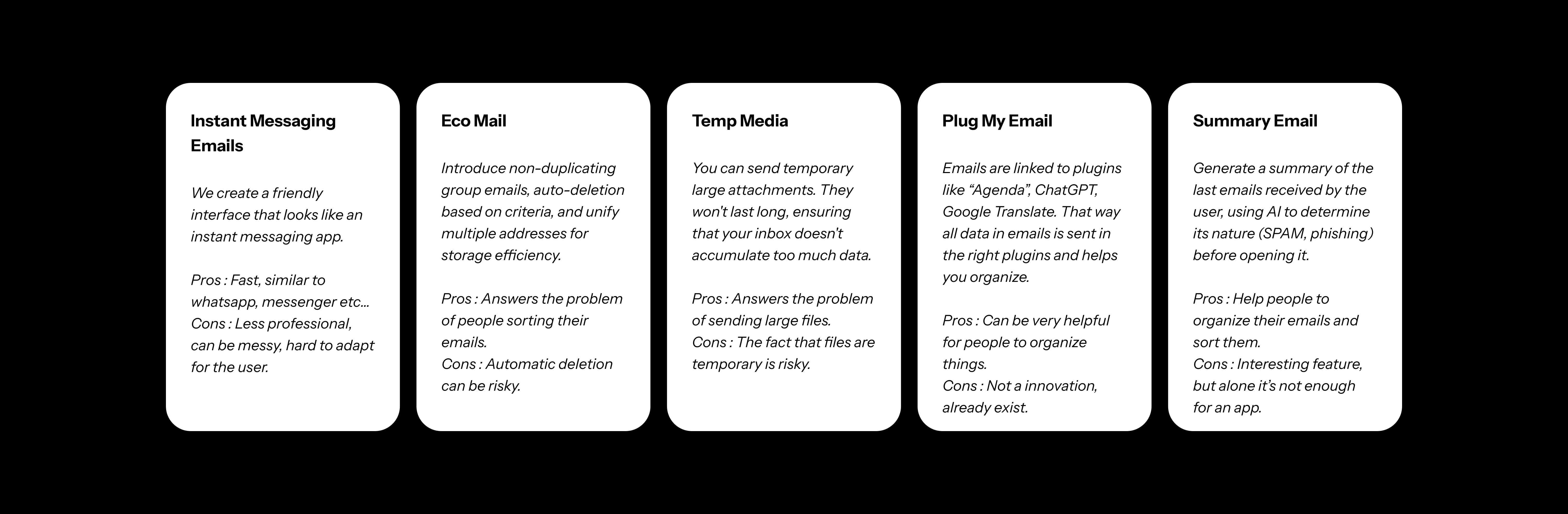 Lors de la présentation aux UX designers de Google, leur conseil a été stratégique. Plutôt qu'un concept isolé, ils nous ont orienté vers la fusion de trois d'entre eux (Temp Media, Summary Email, Eco Mail) pour créer une solution plus complète.