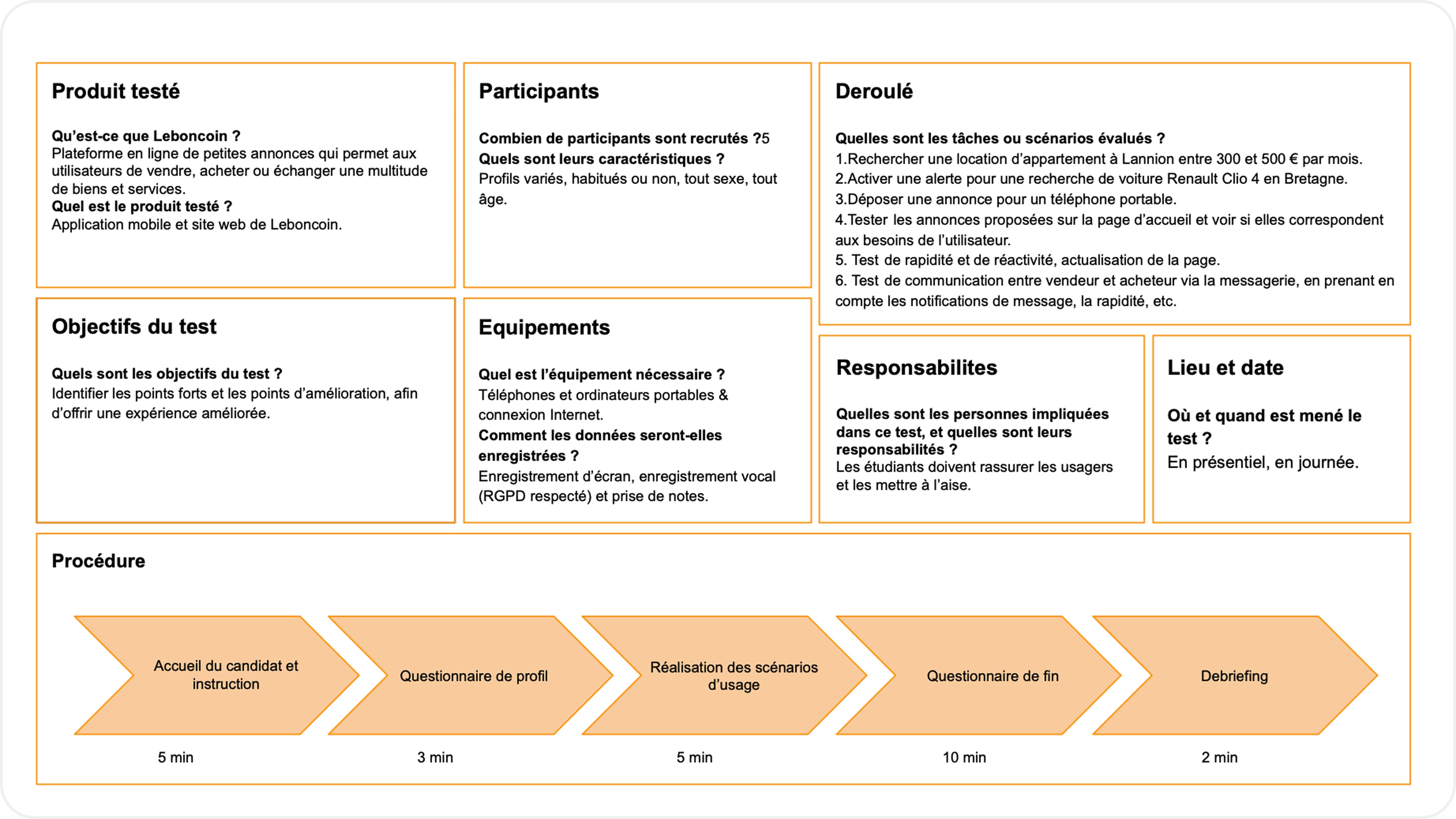 Le cahier fixait l'objectif suivant : identifier les points de friction et d'amélioration de Leboncoin. Il proposait 7 scénarios à tester : recherche, alerte, publication, page d'accueil, accessibilité, rapidité, messagerie.