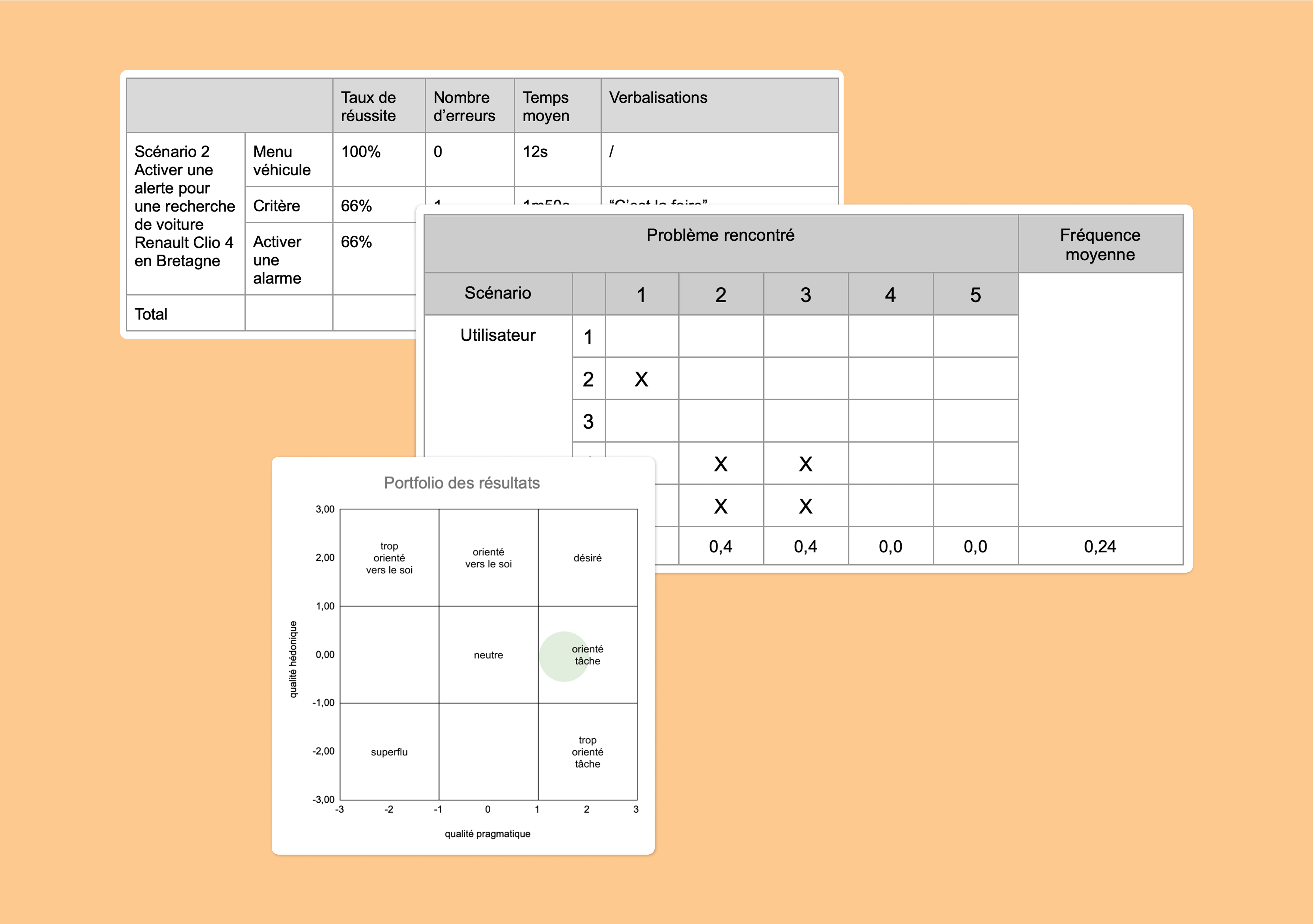 Nous avons commencé par visionner les enregistrements et compléter les informations des grilles d'observation, en capturant taux de réussite, erreurs de clics, temps d'exécution et verbatims exacts. En parallèle, nous avons constitué les tableaux synthétiques par scénario (taux de réussite par étapes, erreurs, temps moyen) afin d’obtenir un tableau fréquence/sévérité pour identifier les scénarios présentant des problèmes récurrents. Tout ceci a été réalisé avant d'analyser les résultats du questionnaire utilisé AttrakDiff permettant de mesurer l’expérience utilisateur d’un produit selon son utilisabilité et son attrait.
